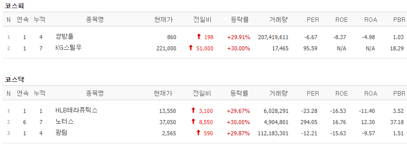 코스피에서는 쌍방울, KG스틸우가 상한가를 기록했고, 코스닥에서는 HLB테라퓨틱스, 노터스, 광림이 상한가를 기록했습니다.