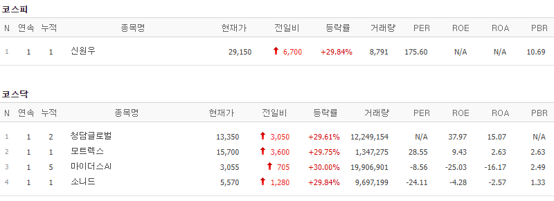코스피에서는 신원우가 상한가를 기록했고, 코스닥에서는 청담글로벌, 모트렉스, 마이더스AI, 소니드 등의 종목이 상한가를 기록했습니다.