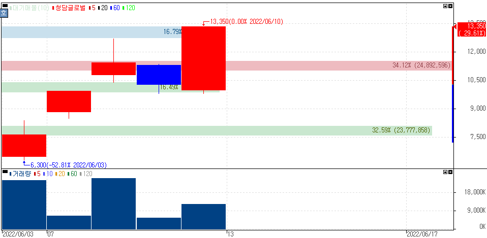 22년 신규상장 종목 강세 및 중국 상반기 블랙프라이데이 618 앞두고 상한가를 기록한 청담글로벌 주가 입니다.