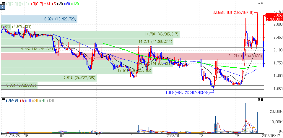 22년 신규상장 종목 강세 및 중국 상반기 블랙프라이데이 618 앞두고 상한가를 기록한 청담글로벌 주가 입니다.