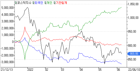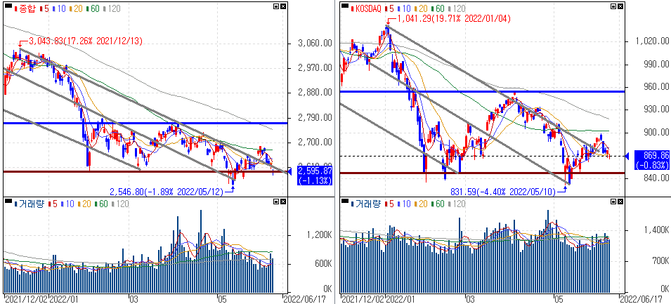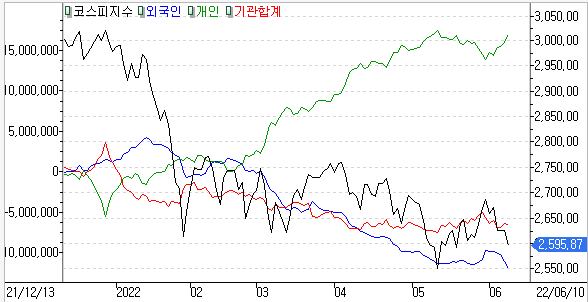 금일 코스피 지수는 -1.13% 하락한 2,595.87에 마감하였고, 코스닥 지수는 -0.03% 하락한 869.86에 마감하였습니다. 글로벌 긴축 우려가 커지면서 외국인의 매도세에 하락했습니다.