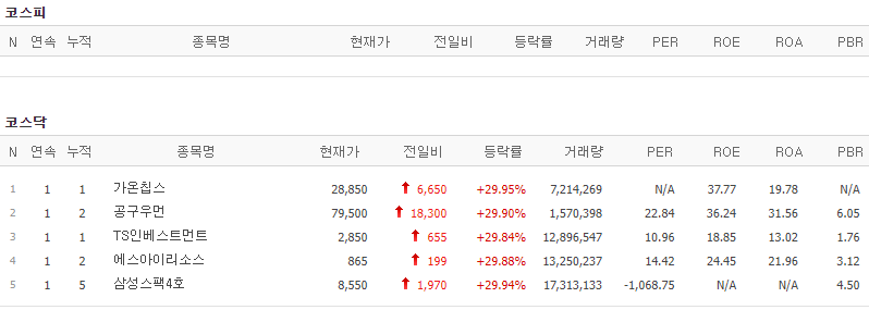 코스피에서는 상한가 종목이 없었고, 코스닥에서는 가온칩스, 공구우먼, TS인베스트먼트, 에스아이리소스, 삼성스팩4호가 상한가를 기록했습니다.