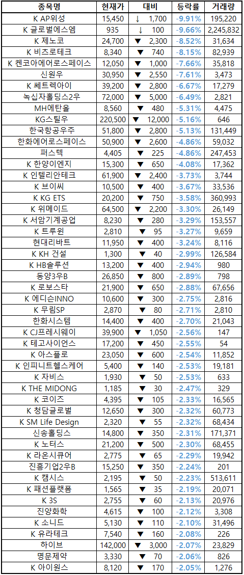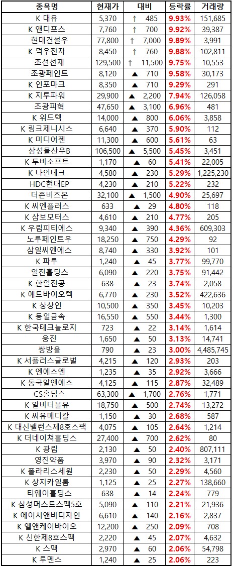 (종목명 앞에 'K'는 코스닥 종목을 의미합니다.)