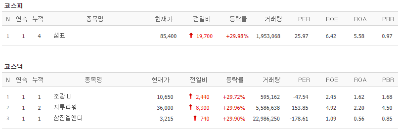코스피에서는 샘표가 상한가를 기록했고, 코스닥에서는 조광ILI, 지투파워, 삼진엘앤디가 상한가를 기록했습니다.