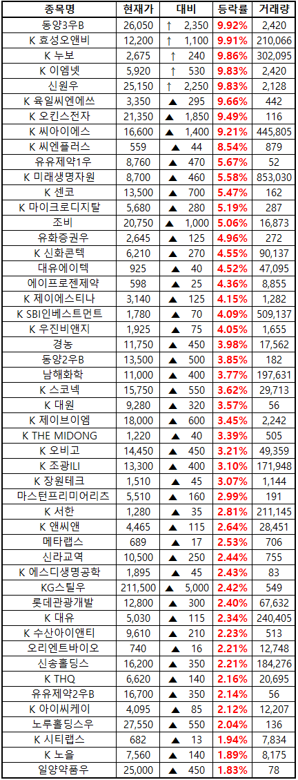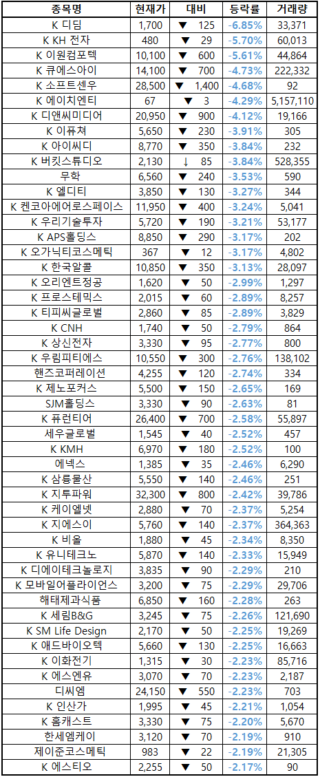 (종목명 앞에 'K'는 코스닥 종목을 의미합니다.)