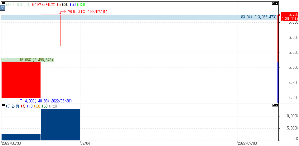 반면 삼성스팩6호는 이틀연속 상한가를 기록하고 있는 만큼 리스크를 배제할 수 없다는 점도 생각해 둘 수 있습니다.