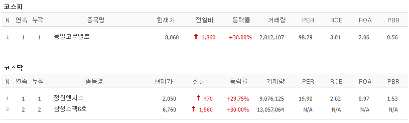 2022년 7월 1일 오늘의 상한가 종목 및 이유 :: 동일공무벨트, 정원엔시스 주가 외