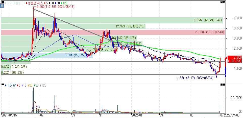 웰컴저축은행과 IT 현대화 실현 소식 속 상한가를 기록한 정원엔시스 주가 입니다.