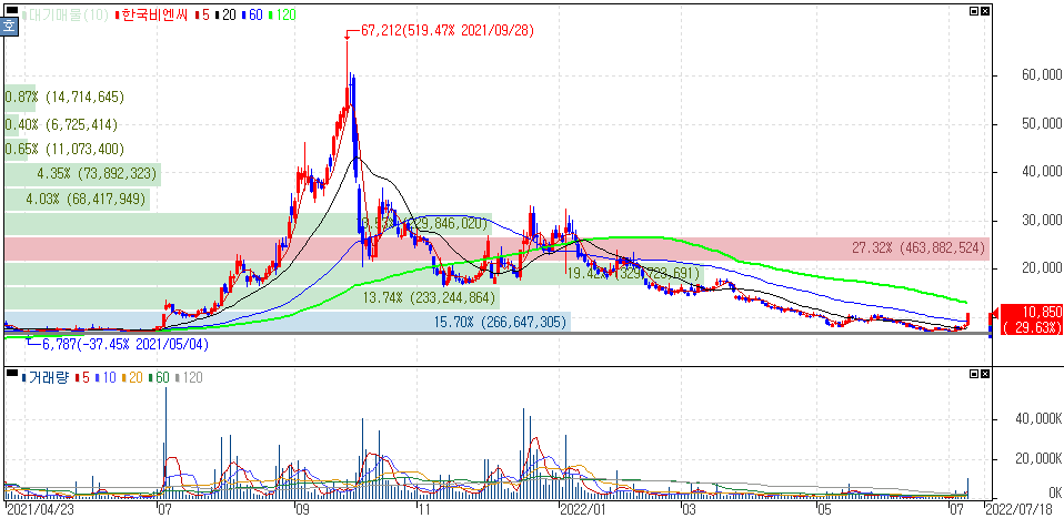 수익실현에 있어서 각 종목마다 매수포인트에 따라 달라질 수 있겠지만 한국비엔씨의 경우 이번 상한가를 보여준 만큼 기준선을 확인하면서 단기적인 움직임에 대응을 하는 방법이 있습니다.