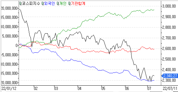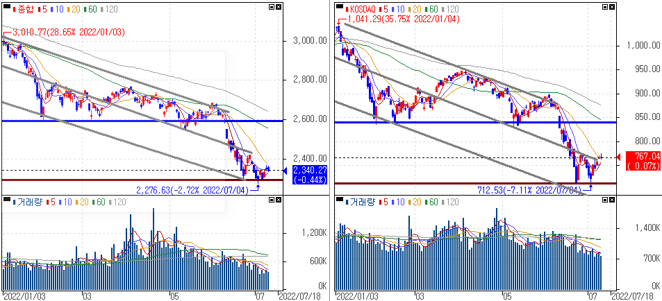 금일 코스피 지수는 -0.44% 하락한 2,340.27에 마감하였고, 코스닥 지수는 +0.07% 상승한 767.04에 마감하였습니다. Fed의 공격적 긴축 우려 지속과 미국 CPI 및 한은 금통위 경계감을 보이는 모습이였습니다.