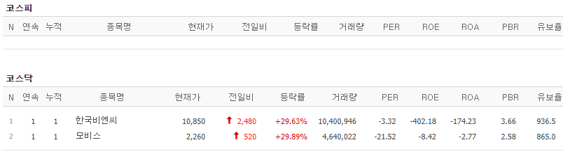 코스피에서는 상한가 종목이 없었고, 코스닥에서는 한국비엔씨, 모비스가 상한가를 기록했습니다.