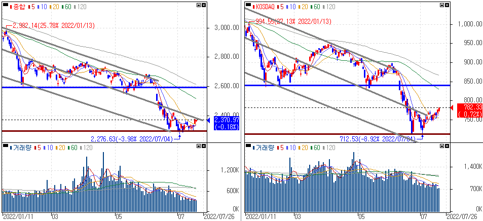 우선 국내외 증시는 앞서 이야기 했었던대로 구간을 형성하는 모습이 보이고 있습니다. 계속 이야기 드리고 있는 부분으로는 추세가 전환되지 않은 상황에서 무리한 접근보다는 시장을 읽어가면서 그때 그때 대응하는 것이 중요하죠.