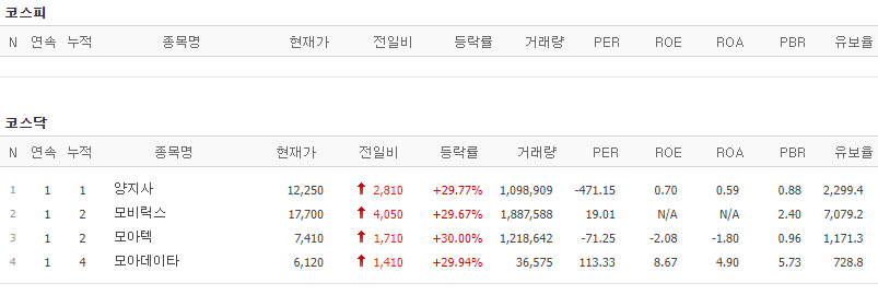 코스피에서는 상한가 종목이 없었고, 코스닥에서는 양지사, 모비릭스, 모아텍, 모아데이타가 상한가를 기록했습니다.