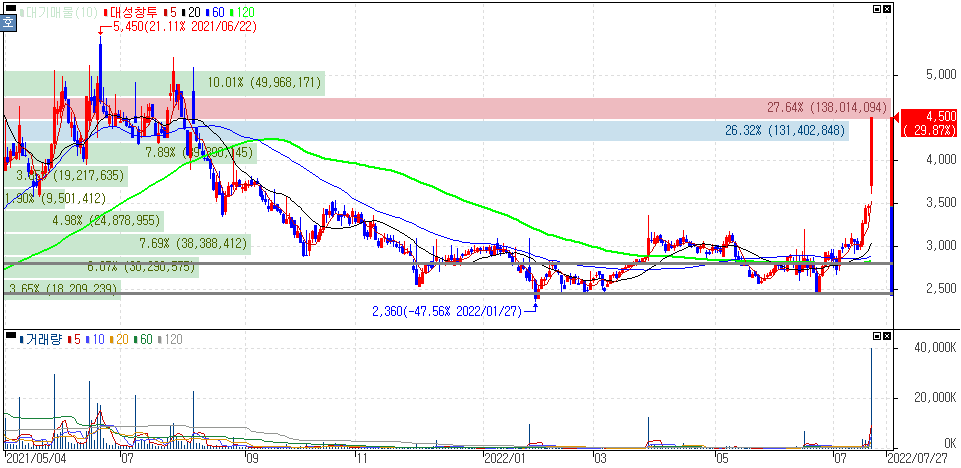 영화 '한산' 흥행 기대감 속 관련주 부각되면서 상한가를 기록한 대성창투 주가 입니다.