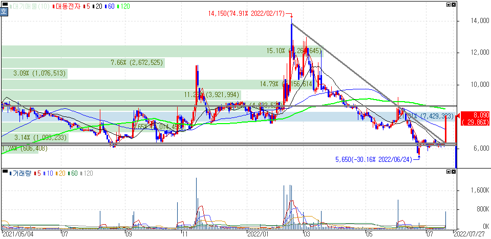 이러한 배경에 대동그룹주가 강세를 보였는데 상한가를 기록한 대동전자 외 대동기어 +16.62%, 대동금속 +10.12%, 대동스틸 +6.24%, 대동 +3.04%를 보였습니다.