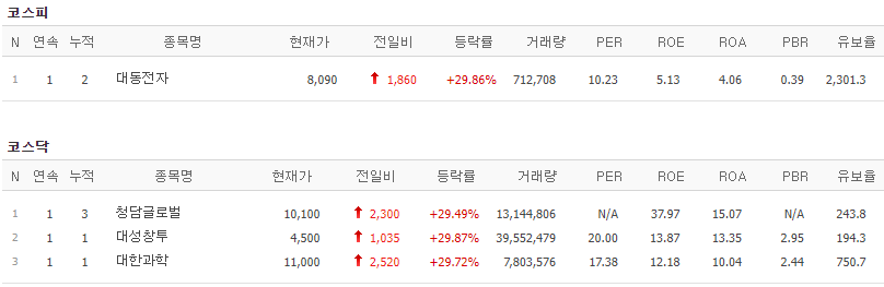 코스피에서는 대동전자가 상한가를 기록했고, 코스닥에서는 청담글로벌, 대성창투, 대한과학이 상한가를 기록했습니다.