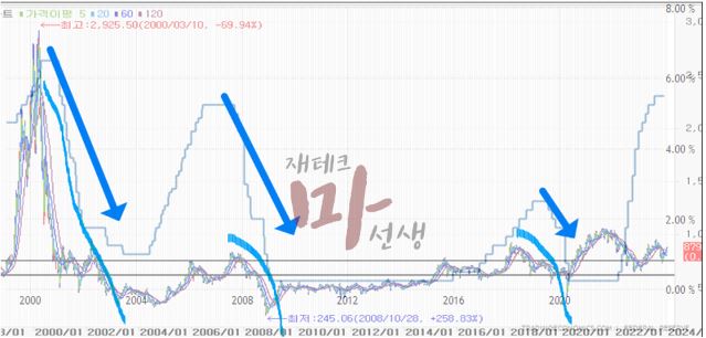 하지만 과거 미국의 기준금리 인상과 인하에 따르는 국내증시 흐름을 빼놓을 수 없습니다. 물론 직접적인 영향을 받아 이러한 흐름을 보였다는 표현을 할 수 없지만 전체적인 금리인하와 국내증시의 흐름 속에는 일맥상통한 부분들이 있다는 점들이 있다는 것을 염두하면서 봐둘 수 있습니다.