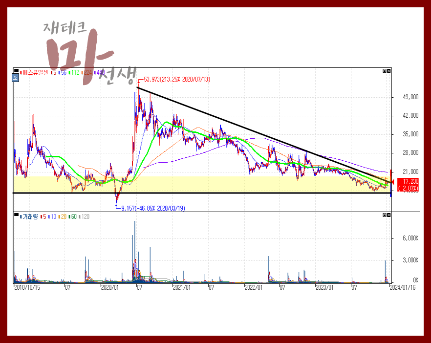 에스퓨얼셀 주가는 지난 2020년 7월 고점을 보인 이후 지속적인 하락세를 보이면서 3년의 시간이 지났습니다. 이 3년의 시간동안 일부 현혹이 될 수 있는 구간이나 단기적인 수익 기간을 이끌어 낼 수 있었던 기간도 있지만 실질적으로 고점 매수 했던 투자자들의 입장에서는 5만원의 주가가 1만원 후반대 주가로 떨어졌다는 것이 현실입니다.