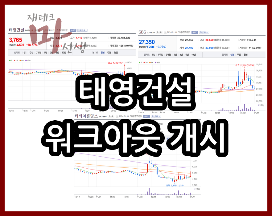 이러한 분위기 속 태영건설, 태영건설우, 티와이홀딩스, SBS 주가에 대한 관심을 받고 있는 상황입니다. 당장 워크아웃이 개시된 상황에서는 등락폭에 영향을 줄 수 밖에 없다는 건 쉽게 생각해 볼 수 있는데요.