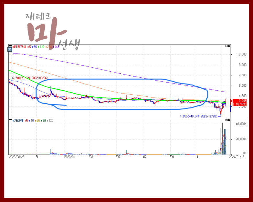 사실 태영건설 주가는 2021년 5월 14,250원대에서 크게 떨어진 이후 2022년 하반기부터 횡보세가 길었던 종목입니다. 특히 이러한 구간에서 무조건 반등으로 이어진다고 오해 하는 경우가 많은데 '지독한 구간'이 될 수 있었다는 것을 유의해야 합니다.