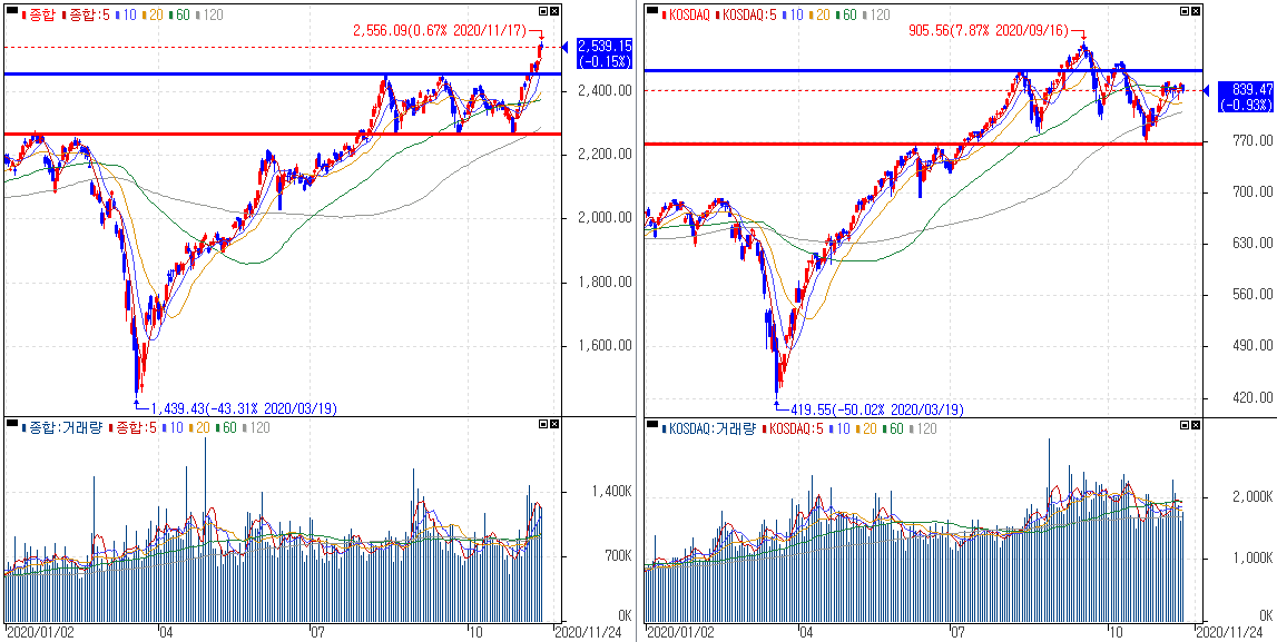 금일 코스피 지수는 -0.15% 하락한 2,539.15에 마감하였고, 코스닥 지수는 -0.93% 하락한 839.47에 마감하였습니다. 코로나, 트럼프, 북한 김정은 등 변동성을 크게 줄 수 있는 요소들을 고려 해야하는 시기입니다. 즉, 완전한 방향이 있기 전까지는 다소 포트 설정시 기준을 까다롭게 잡아볼 필요가 있다는 것이죠. 코스피와 달리 코스닥 지수는 여전히 구간 횡보가 지속되고 있습니다.