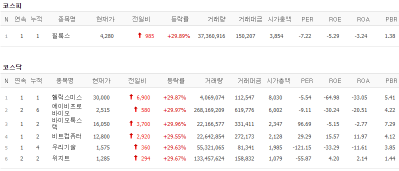 코스피에서는 필룩스가 상한가를 기록했고, 코스닥에서는 헬릭스미스, 에이비프로바이오, 바이오톡스텍, 비트컴퓨터, 우리기술, 위지트가 상한가를 기록했습니다.