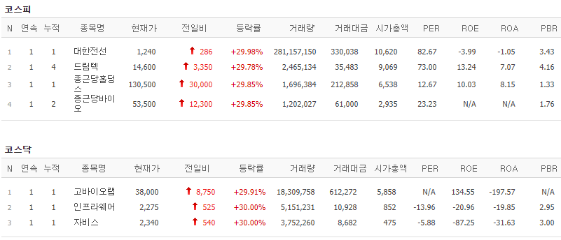 코스피에서는 대한전선, 드림텍, 종근당홀딩스, 종근당바이오에서 상한가를 기록했고, 코스닥에서는 고바이오랩, 인프라웨어, 자비스가 상한가를 기록했습니다.