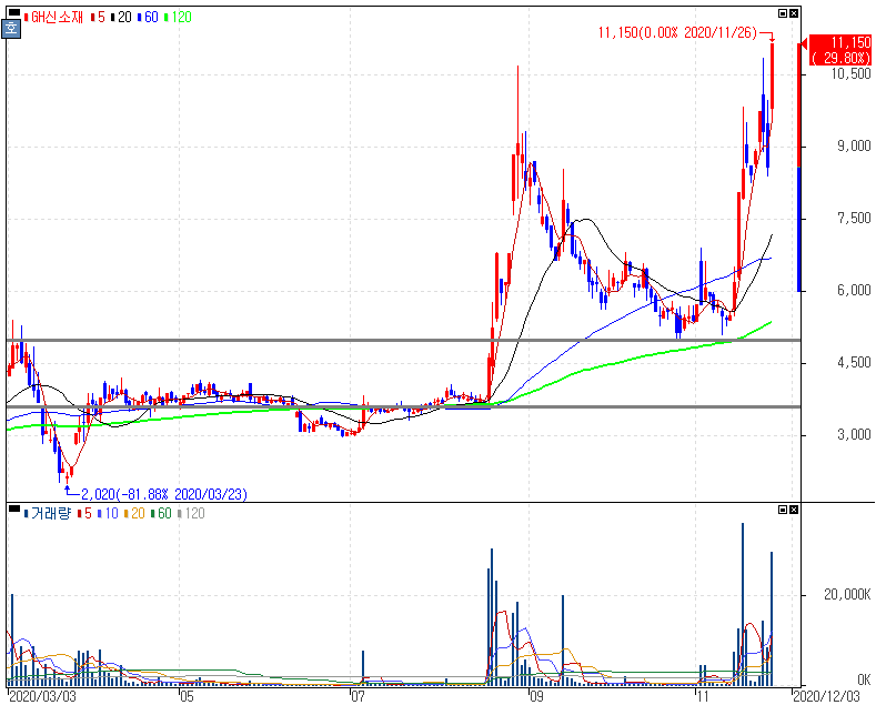 국내 코로나19 신규 확진자 500명대 대규모 확산 발생 되면서 택배박스, 음압병실에 테마 상승 속 상한가를 기록한 GH신소재 주가 입니다. 금일 상한가 종목들의 특징이 추세가 다 살아있다는 점입니다.