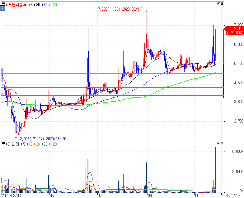 국내 코로나19 신규 확진자 500명대 대규모 확산 발생 되면서 간편식 수요 급증 기대감에 상한가를 기록한 서울식품우 주가 입니다. 앞서 본 페이퍼코리아 주가와 마찬가지로 추세가 유지해왔다는 점을 볼 수 있습니다.
