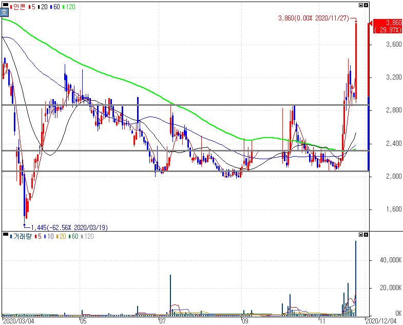 정부, 존슨앤존슨/노바백스 등 코로나19 백신 국내 도입 유력 전망에 관련주로 부각되며 상한가를 기록한 인콘 주가 입니다. 정부가 코로나19 백신 도입을 유력하게 검토하고 있는 업체로 존슨앤존슨과 아스트라제네카, 노바백스로 인콘의 美 자회사가 존슨앤존슨 부회장 출신 전문가를 이사회 의장으로 선임한 사실로 부각 됐으며, 노바백스와 코로나19 백신 후보물질 'NVX-CoV2373'의 대규모 생산을 위한 위탁계약을 체결한 후지필름 다이오신스 바이오테크놀로지스를 자회사로 보유하고 있는 후지필름이 2대주주로 있는 디알젬이 시장에서 부각되며 동반 급등을 보이며 %로 상승 마감하였습니다.