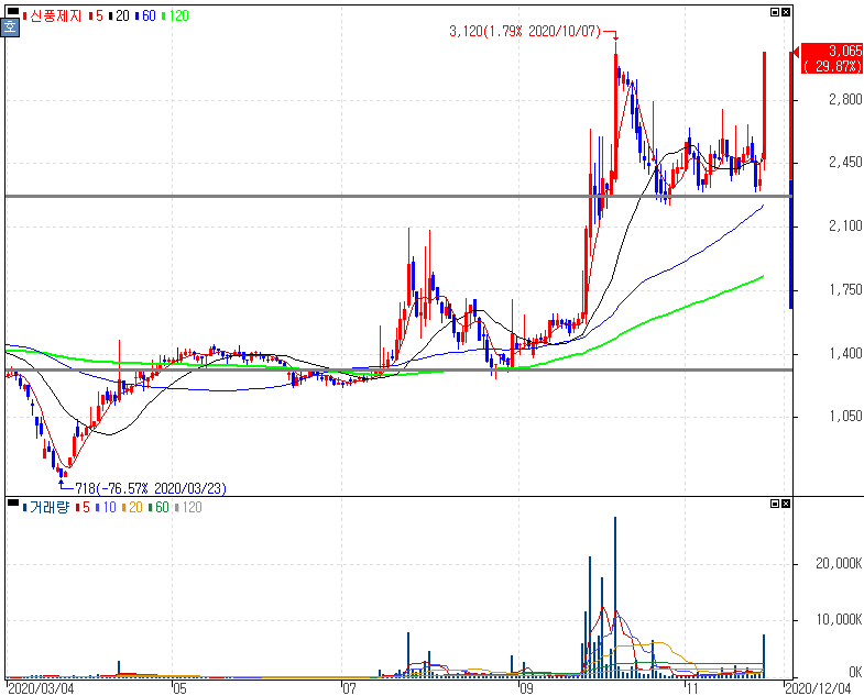 코로나19 확산세 지속 속 골판지 가격 인상 기대감 등에 상한가를 기록한 신풍제지 주가 입니다. 27일 0시 기준 국내 코로나19 확진자는 569명으로 집계되면서 이틀연속 500명대를 기록하는 중에 한국골판지포장산업협동조합에서 지난 25일 가수요 주문 자제와 납품 가격에 원부자재 인상분 반영을 골자로 공문을 보냈다는 사실이 함께 부각 됐습니다.