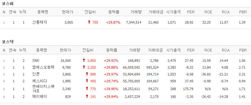 코스피에서는 신풍제지가 상한가를 기록했고, 코스닥에서는 SNK, 엠에스오토텍, 인콘, 에스씨디, 엔에이치스팩14호, 제이웨이가 상한가를 기록했습니다.