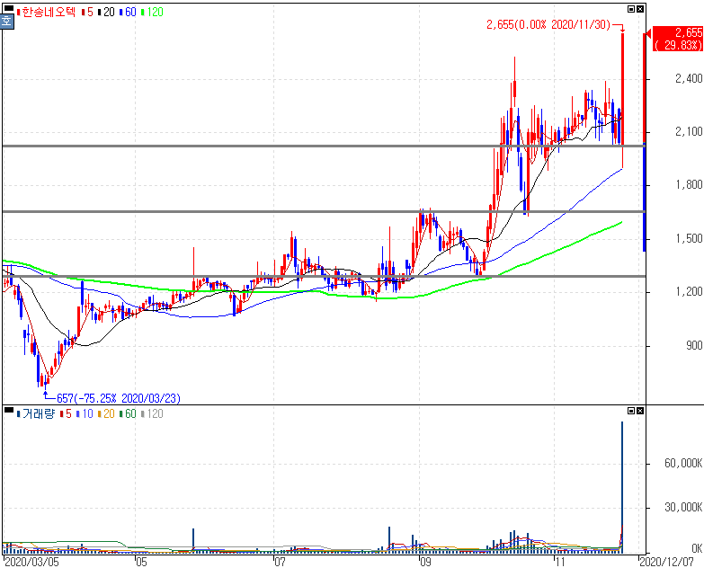 2차전지 분리박 신기술 부각에 상한가를 기록한 한송네오텍 주가 입니다. 한국전자기술연구원(KETI)으로부터 2차전지 분리막 제품의 시험성적서를 수령하면서 향후 확보하는 차세대 2차전지 분리막 기술을 주요 배터리 제조사들이 사용하고 있는 PE, PP 소재 필름 구조가 아닌 폴리비닐리덴플로라이드(PVDF)와 폴리에틸렌 테레프탈레이드(PET)를 합성한 부직포 멤브레인(Non-woven Membrane)에 특수코팅기술을 접목한 기술로 전기차 배터리 시장에서 우려하는 화재나 폭발 위험성을 최소화할 수 있다는 평가까지 받고 있습니다.