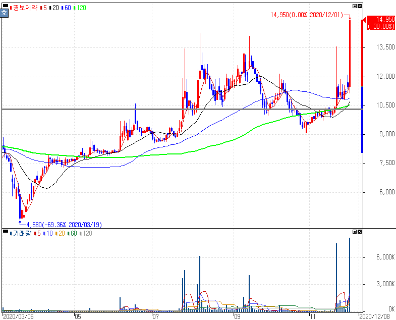 계열사 종근당이 임상중인 코로나19 치료제 '나파벨탄'의 주성분 나파모스타트 개발중인 사실 재부각에 상한가를 기록한 경보제약 주가 입니다. 어제 상한가를 기록했던 종근당바이오는 금일 장중 +21.34% 상승을 보였으나 +4%대로 마감하였습니다. 과거에도 나파모스타트와 관련해 종종 부각을 보였던 경보제약 역시 추세를 잘 유지 해왔다는 것을 참조해볼 수 있습니다.