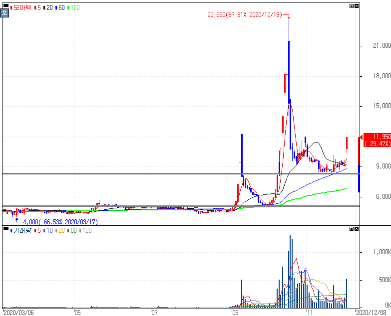 저유동성종목 단일가매매 해제 속 상한가를 기록한 모아텍 주가 입니다. 한국거래소 코스닥시장본부는 전일 장 마감 후 12월1일부터 12월30일까지 동사의 정규시장 매매체결방법으로 적용중인 단일가매매(10분단위매매)를 해제한다고 공시나왔습니다. 모아텍은 지난 10월에 재료미노출의 이상 급등을 보였던 종목입니다. 당시에도 늘 말씀드렸던대로 추가 상승을 하더라도 주의해야한다고 말씀드렸지만 어김없이 급락을 보이면서 추격매수의 위험성을 알려준 종목이죠. 급격한 하락 이후 이번처럼 반등이 나오는 경우가 상당수 많습니다만 개인적으로는 모아텍보다 시장 원리를 이용한 종목접근이 더 좋다고봅니다.