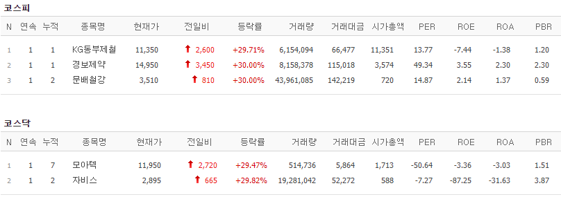 코스피에서는 KG동부제철, 경보제약, 문배철강이 상한가를 기록했고, 코스닥에서는 모아텍, 자비스가 상한가를 기록했습니다.
