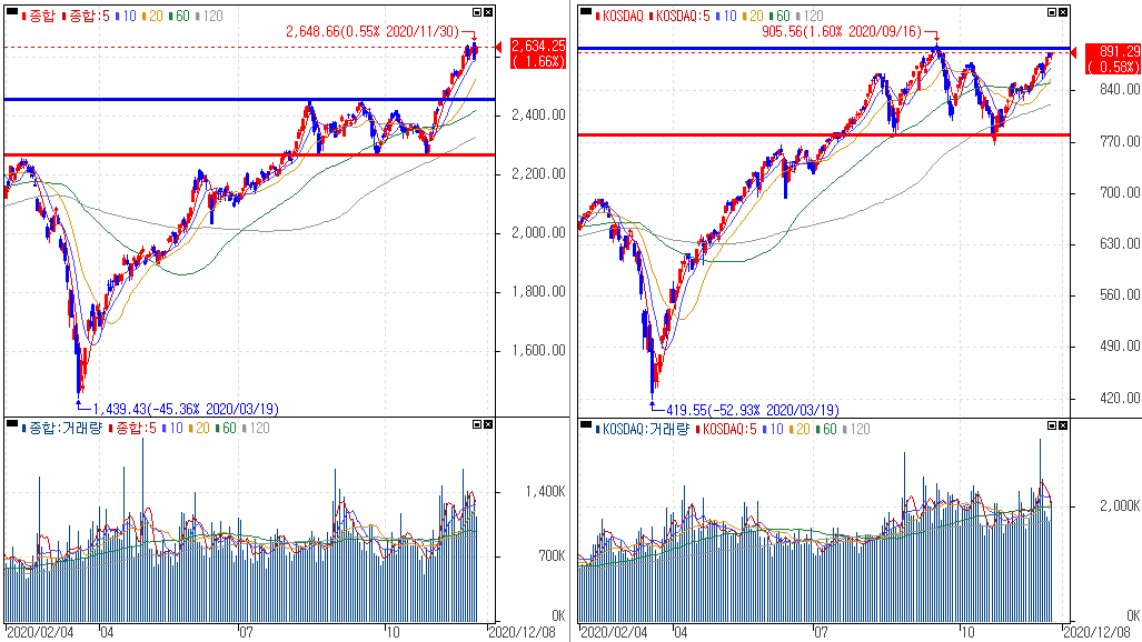 금일 코스피 지수는 +1.66% 상승한 2,634.25에 마감하였고, 코스닥 지수는 +0.58% 상승한 891.29에 마감하였습니다. 지금의 구간에서 돌파를 보여주지 못한다면 하락전환이 전혀 이상하지 않은 자리입니다. 확연히 돌파하는 것을 확인한 후에 움직여도 늦지 않습니다.