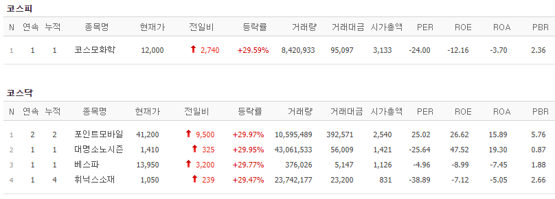 코스피에서는 코스모화학이 상한가를 기록했고, 코스닥에서는 포인트모바일, 대명소노시즌, 베스파, 휘닉스소재가 상한가를 기록했습니다.