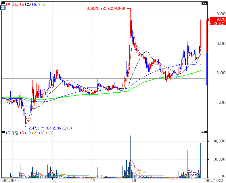 국내 코로나19 신규 확진자 수 사상 최대치 기록 등에 상한가를 기록한 링네트 주가 입니다. 국내 코로나19 신규 확진자 수는 1,078명을 기록했습니다. 이는 국내에서 코로나19 확진자가 발생한 이래 역대 최대치로 이 소식에 진단키트 관련주에서 바이오스마트, 미코바이오 등 음압병실 관련주에서 에스와이, 코오롱글로벌 등, 포장(제지) 관련주 영풍제지, 대양제지, 한창제지, 무림페이퍼 등, 재택근무 관련주로 링네트, 이씨에스 등 강세 흐름을 보였습니다.