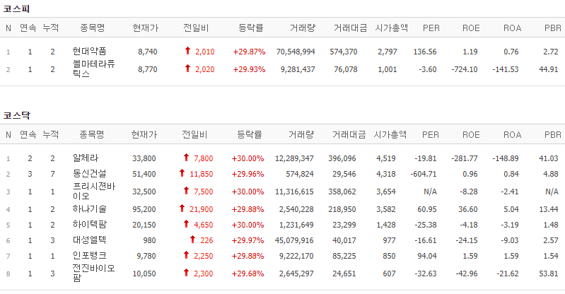 코스피에서는 현대약품, 쎌마테라퓨틱스가 상한가를 기록했고, 코스닥에서는 알체라, 동신건설, 프리시젼바이오, 하나기술, 하이텍팜, 대성엘텍, 인포뱅크, 전진바이오팜이 상한가를 기록했습니다.