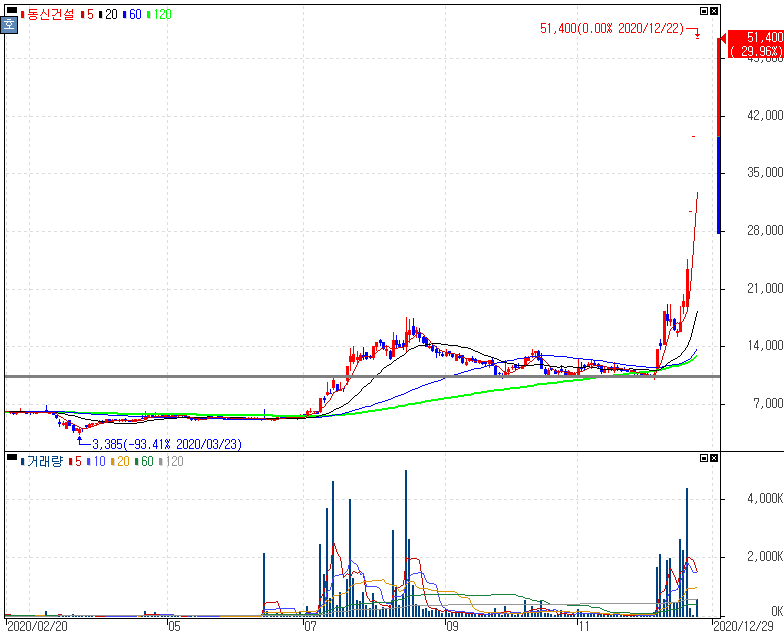 이재명 경기도지사, 차기 대통령감 1위 소식 모멘텀 지속에 이재명 테마주 상승 속 상한가를 기록한 동신건설 주가 입니다. 어제 이재명 관련주 강세에 이어 오늘도 어김없이 강한 상승을 보였습니다. 약 5배 상승을 보인 주가 흐름에 도박성 매매는 위험하다는 것을 기억하시길 바랍니다.