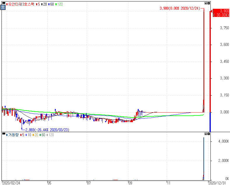 상장예비심사결과 승인 속 거래재개 후 상한가를 기록한 유안타제3호스팩 주가 입니다. 스팩주의 시즌이 맞죠. 유안타제3호스팩은 상장예비심사결과 승인 속 거래재개하면서 급등을 보이고 상한가로 연결됐습니다. 피부미용의료기기 제조 및 판매업체 (주)제이시스메디칼과 합병 관련 상장예비심사결과 통지(승인) 공시해 지난 9월22일부터 거래가 정지됐던 유안타제3호스팩입니다. 스팩 합병 일정이 앞다퉈 쏠려 있는 분위기이나 스팩주 종목들의 다분히 부각을 보이고 있는 시즌입니다. 지난 DB금융스팩7호에 이어 몇몇 스팩주의 강세, 오늘은 엔에이치스팩14호가 장중 상한가를 기록했다는 점도 참고해 볼 수 있습니다. 재차 강조드리지만 스팩주가 합병에 대한 기대감으로 급등을 보이는 건 사실이지만 무조건 합병이 된다는 보장은 없다점도 참고하시길 바랍니다.