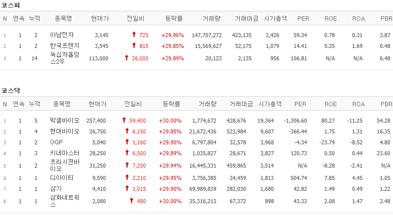 코스피에서는 아남전자, 한국프랜지, 녹십자홀딩스2우가 상한가를 기록했고, 코스닥에서는 박셀바이오, 현대바이오, OQP, 키네마스터, 프리시젼바이오, 디아이티, 삼기, 삼화네트웍스가 상한가를 기록했습니다.