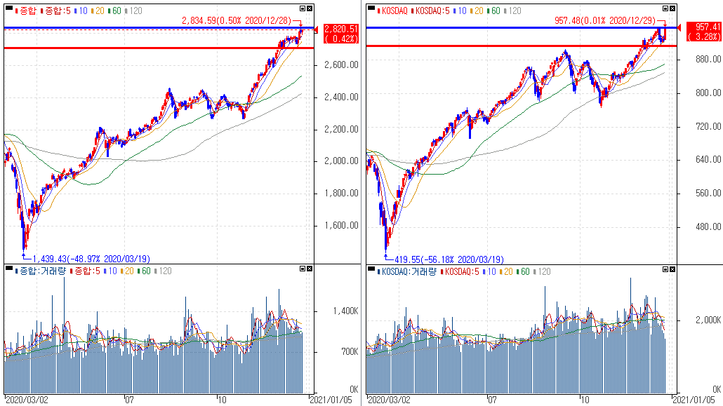금일 코스피 지수는 +0.42% 상승한 2,820.51에 마감하였고, 코스닥 지수는 +3.28% 상승한 957.41에 마감하였습니다. 긴 상승세가 계속 이어져가고 있습니다. 이런 상승장에서 잊지 말아야 할 것은 본인의 투자원칙에 따르는 안정적인 수익실현과 위기대응능력을 반드시 점검하시길 바랍니다.
