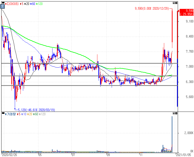 日 2050년 脫석탄 산업별 로드맵 발표에 따른 수혜 기대감에 2차전지/수소차 테마 상승 속 상한가를 기록한 디아이티 주가 입니다. 아직 부각되지 않은 미래차 관련주 종목들에 대한 탐색이 충분하다고 말씀드렸던 만큼 본보기가 되어준 디아이티 주가 입니다. 평판디스플레이 검사 장비, 레이저 응용장비, 2차전지 필름 검사 장비 등을 제조 및 판매하는 디아이티는 주요 완성차 업체의 수소차 관련 장비 공급하는 1차밴더이기도 하죠. 재테크 마선생 블로그와 함께 하시는 분들은 간략한 흐름만 스캔하시더라도 파악이 되실거라 봅니다.