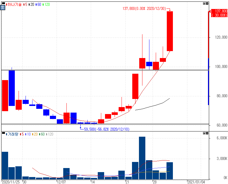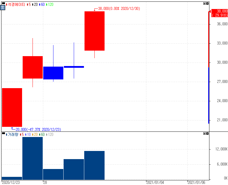 2020년 하반기 신규상장 종목 강세 속 상한가를 기록한 석경에이티 주가 입니다. 하반기 신규상장 종목 + 미래지향 산업 등을 고려해본다면 하반기 신규상장 종목들의 쉽게 좋은 결과를 볼 수 있었던 2개월이였습니다. 2020년의 마지막 날까지도 이런 흐름을 보여주었는데요. 이 흐름이 내년까지도 이어갈지는 지켜봐야 알겠지만 특정 기간에 두드러지는 산업 및 테마 동향을 잘 파악해두는 것이 좋습니다.