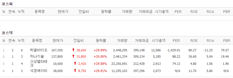 코스피에서는 상한가가 없었으며, 코스닥에서는 박셀바이오, 하나기술, 신성델타테크, 석경에이티가 상한가를 기록했습니다.