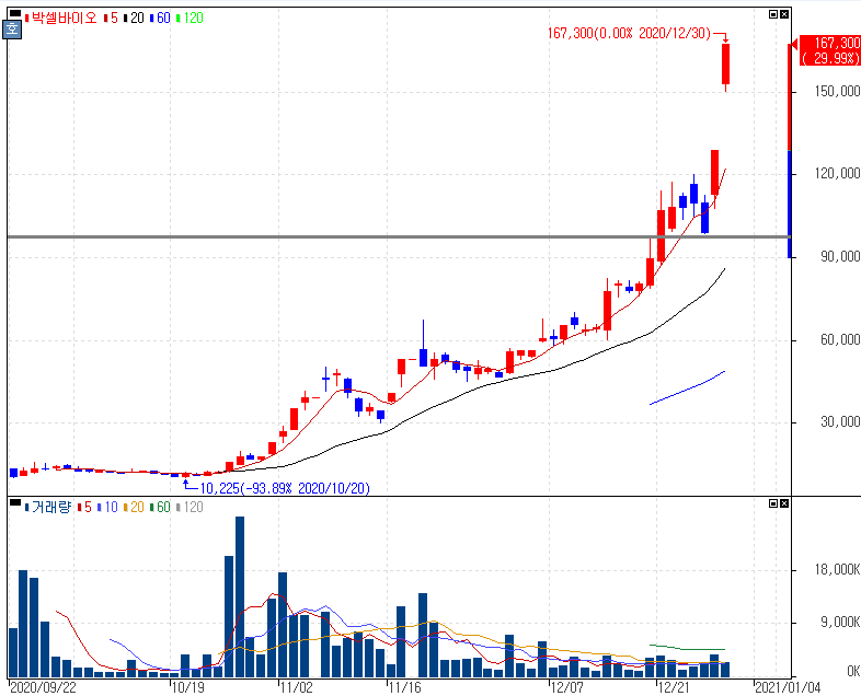 무상증자 권리락 효과 발생하면서 상한가를 기록한 박셀바이오 주가 입니다. 박셀바이오는 항암 면역세포치료제 성장 모멘텀을 가지던 기업으로 상승세를 보여왔습니다. 그러나 재테크 마선생 블로그에서 주요 중점으로 말씀드렸던건 지난 11월 미국 대선을 기준으로 하반기 신규상장 종목들의 흐름에 대해서 말씀드려왔었습니다. 이는 오늘 박셀바이오만 아니라 금일 동반 상한가를 기록한 석경에이티, 강세를 보여준 엔젠바이오(18.03%), 지놈앤컴퍼니(12.13%), 프리시젼바이오(9.60%) 등 2020년 하반기 신규상장 종목들의 주목을 많이 받고 있다는 것을 알 수 있습니다.