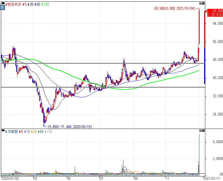 현대차, 2월 '아이오닉5' 공개 예정 소식에 자동차 관련주 상승 속 상한가를 기록한 현대위아, 풍강 주가 입니다. 현대차에서는 빠르면 2월에 전기차 전용 플랫폼 E-GMP를 기반으로 만든 '아이오닉5'를 출시할 것이라는 소식에 부각되었습니다. 아이오닉 시리즈는 오는 공개될 아이오닉5를 시작으로 내년에는 중형 세단 아이오닉6를, 2024년에는 대형 SUV 아이오닉7 등을 순차적인 출시 계획을 가지고 있다는 소식도 참고해 볼 수 있습니다.