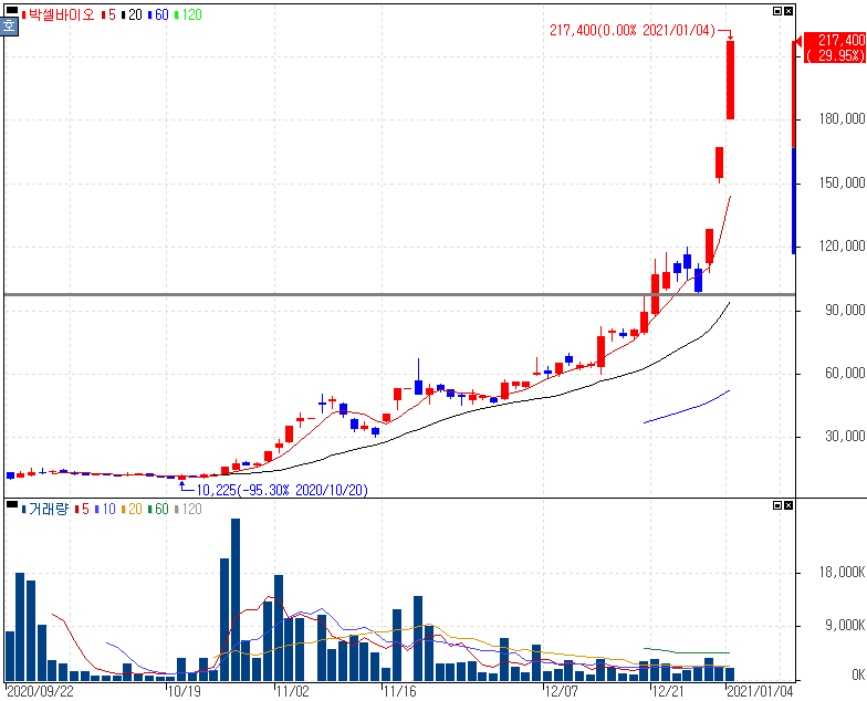 면역세포치료제 기업으로 향후 성장 모멘텀 지속에 상한가를 기록한 박셀바이오 주가 입니다. 지난주 박셀바이오는 무상증자 권리락과 간암세포 치료제(VAX-NK)의 상업화 기대감 등의 면역세포치료제 성장기업 모멘텀까지 겹치면서 지난주 상한가에 이어 3거래일 연속 상한가를 기록한 박셀바이오 주가 입니다.